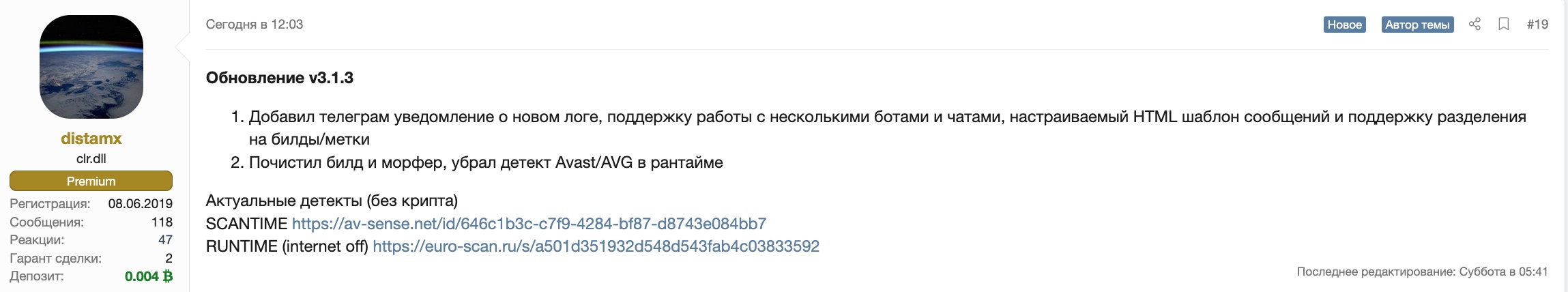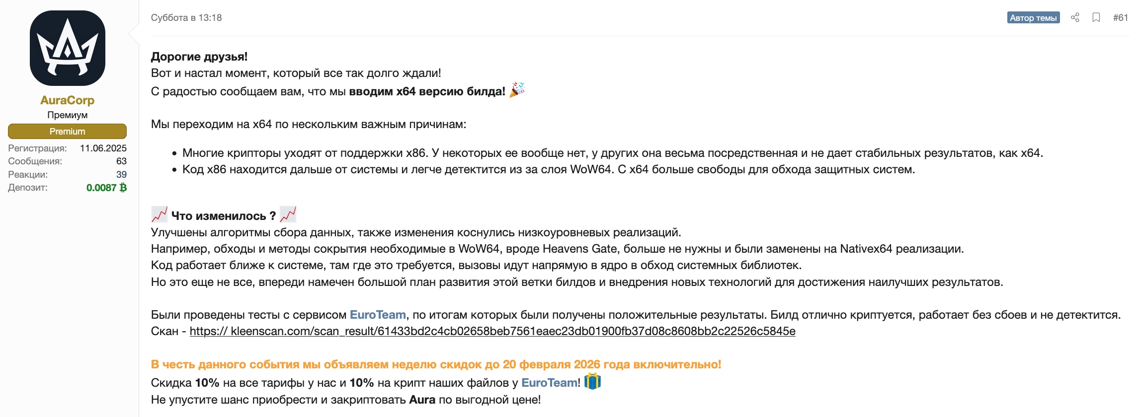 Tests were conducted with the EuroTeam service, which yielded positive results. The build is well encrypted, works without failures, and is not detected.
